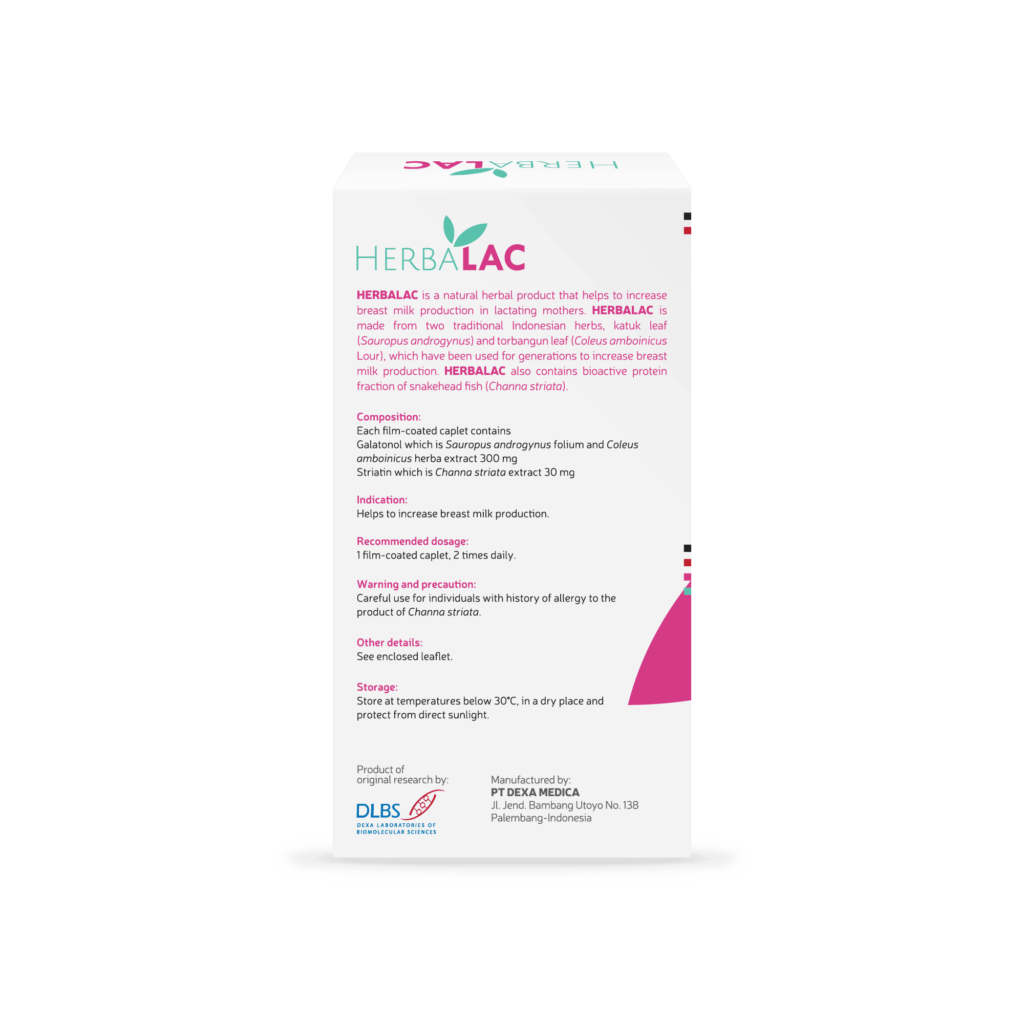 Herbalac is natural herbal product that helps to increase breast milk production in lactating mothers. Herbalac is made from two traditional Indonesian herbs, katuk leaf (Sauropus androgynus) and torbangun leaf (Coleus amboinicus Lour), which have been used for generations to increase breast milk production. Herbalac also contains bioactive protein fraction of snakehead fish (Channa striata).