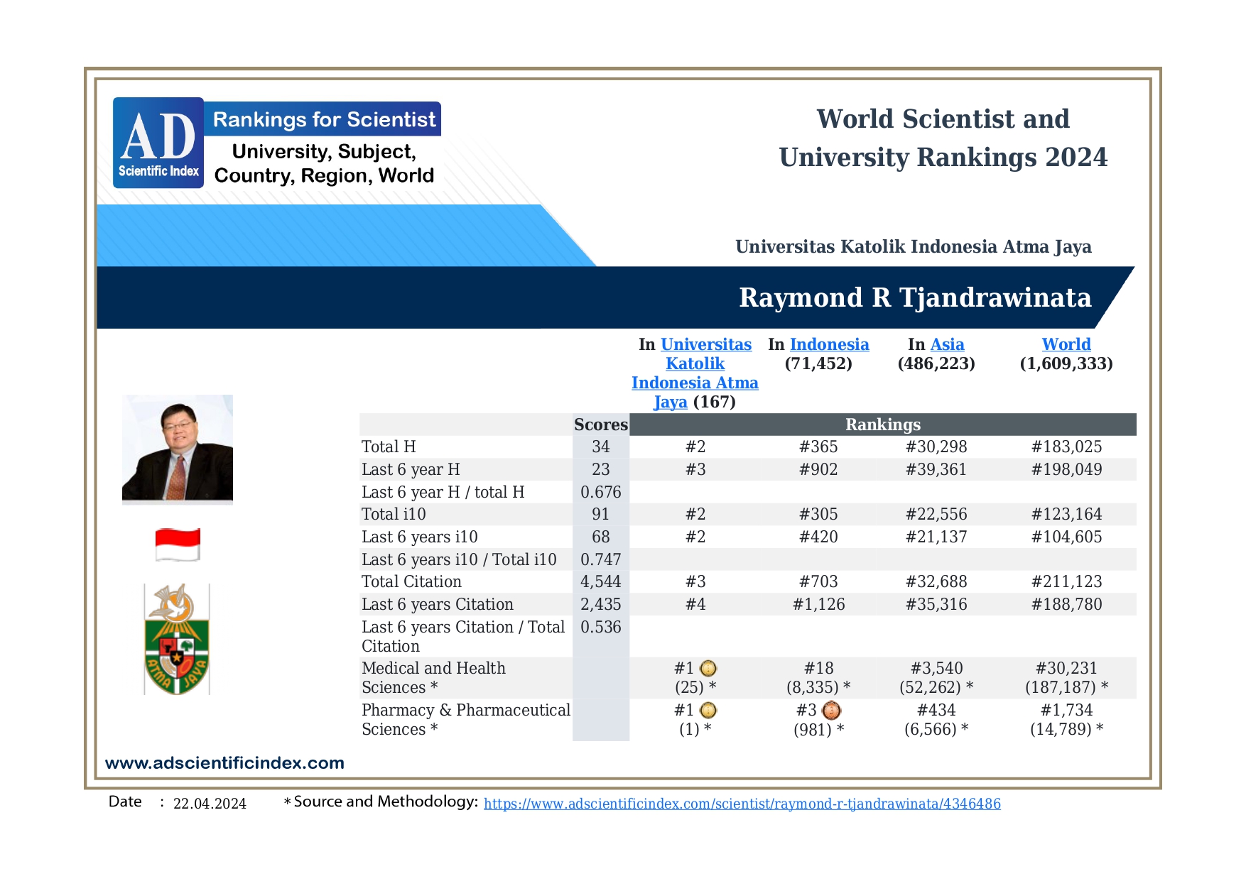In Indonesia, Prof. Raymond ranks third in the pharmaceutical sector and eighteenth in the field of medicine and health. Researchers extensively reference his scientific works in pharmacy, medicine, and health.
